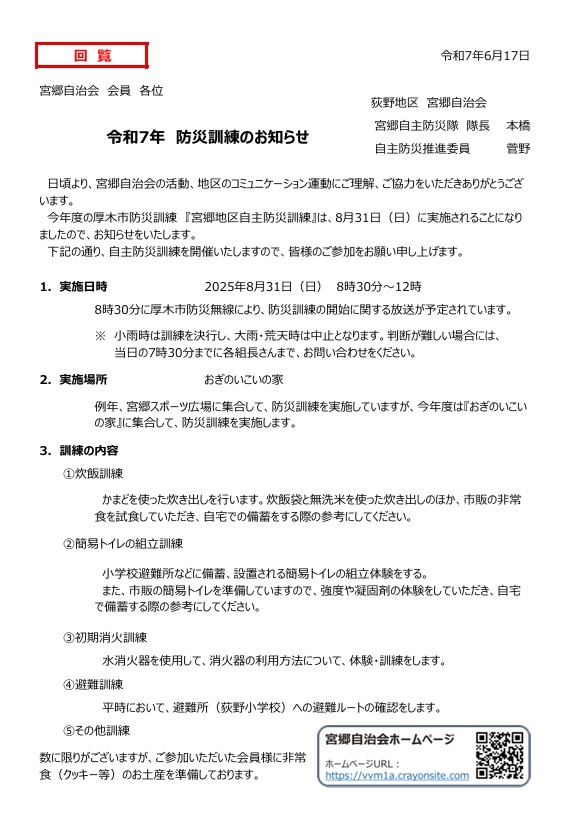 令和7年度の厚木市防災訓練『宮郷地区自主防災訓練』を、8月31日(日)に実施しました。地域の皆さまのご参加・ご協力をいただきありがとうございました。